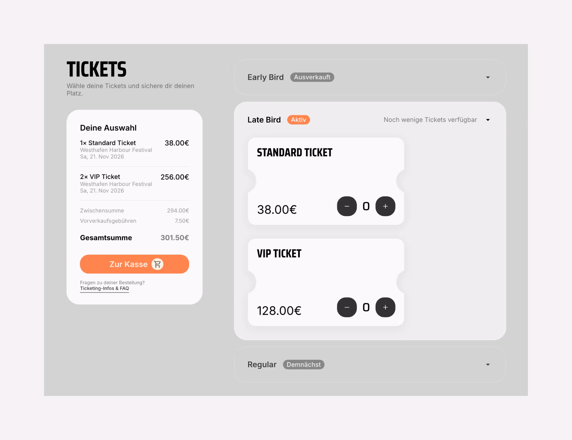 Zahlungen laufen ab sofort über Stripe. Tickets mit QR-Code, Buchungen und Zugänge werden automatisiert vom System gesteuert.