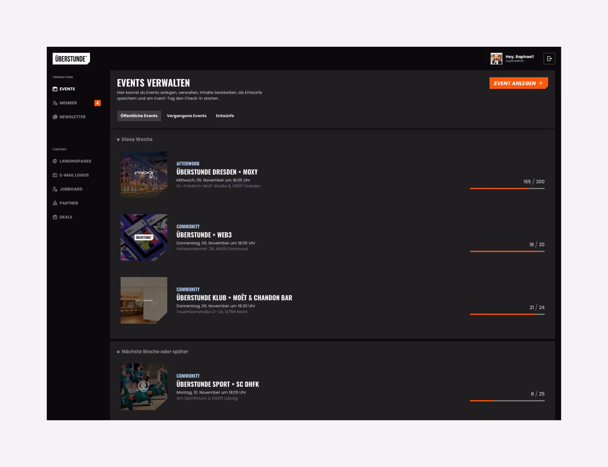 Das interne Mitarbeiter-Portal erleichterte dem Team den Alltag. Events, Newsletter, Sponsoren, Recaps und Nutzer wurden dort einfach und sicher verwaltet.