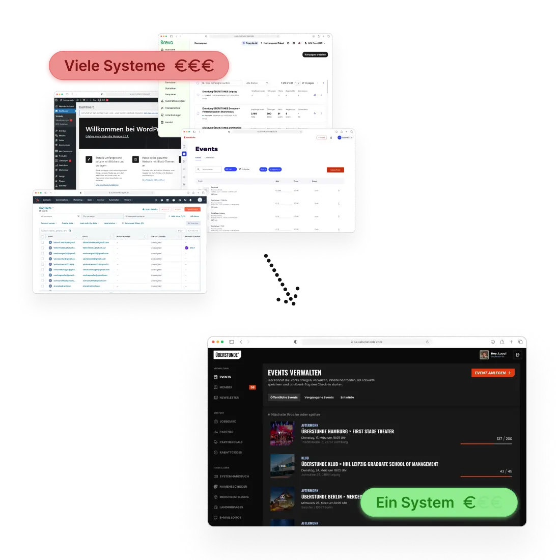 Meist läuft das noch so: Website aus dem Baukasten wie WordPress. Ticketing läuft über Eventbrite oder Eventim. Newsletter macht Brevo. Und am Ende sind es nicht drei Tools, sondern eher sieben.