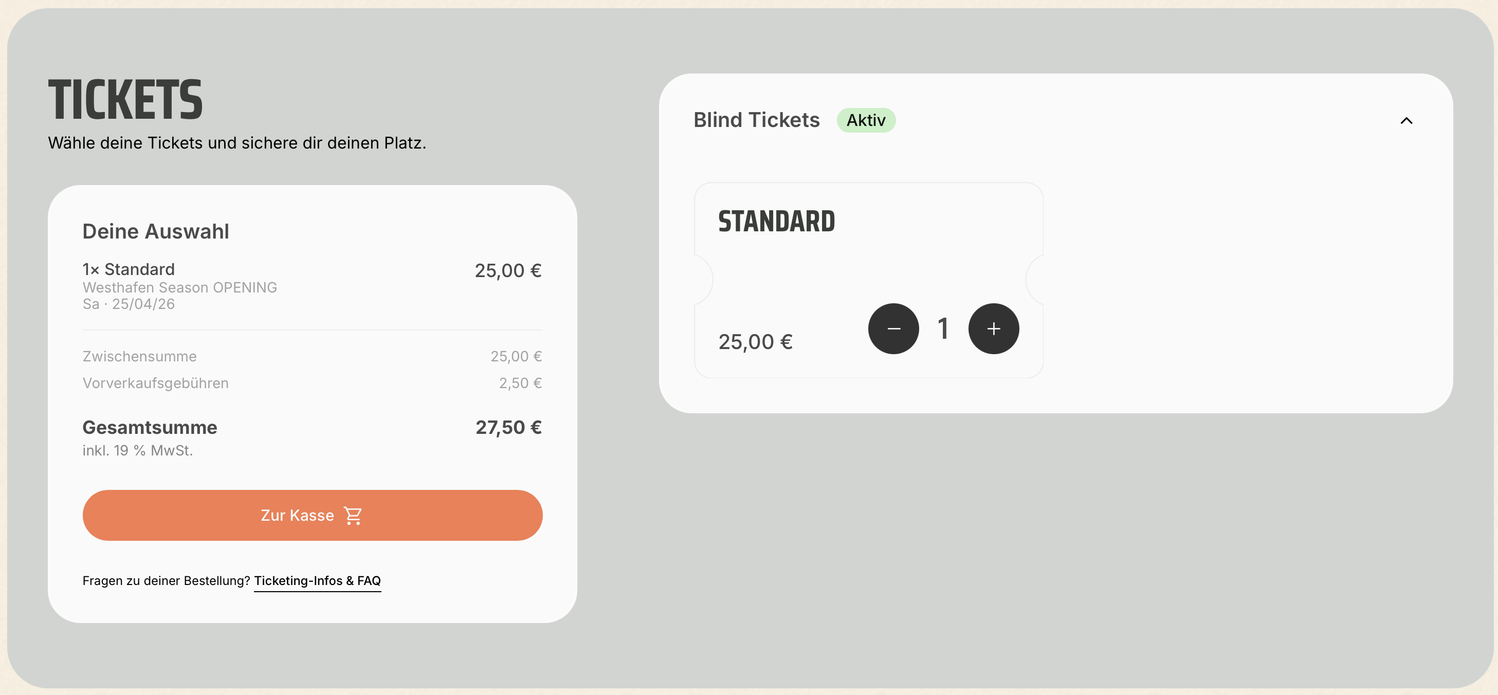 Alle Phasen (Blind, Phase I–III, Regular), Ticketkategorien (z. B. Standard, VIP) und Abendkasse lassen sich direkt im Backend steuern. Preislogiken und Kontingente werden zentral gepflegt, Zahlungsabwicklung läuft über integrierte Payment-Provider – ohne Abhängigkeit von externen Ticketplattformen.