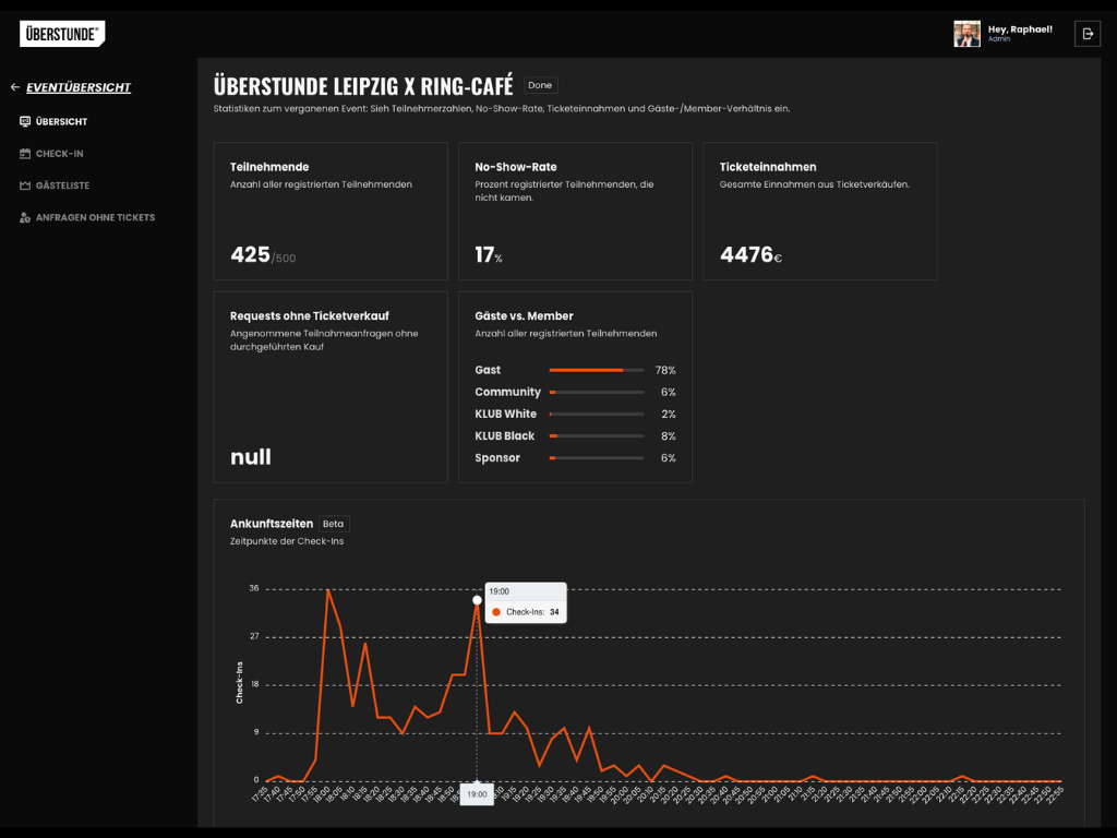 Veranstalter haben Zugriff auf umfangreiche Analytics: Teilnehmerzahlen, No-Show-Rates, Ticketumsätze und Check-in-Zeiten werden automatisch erfasst. Diese Daten bilden die Grundlage für Optimierungen und gezieltere Kommunikation – von Eventplanung bis Marketingstrategie.