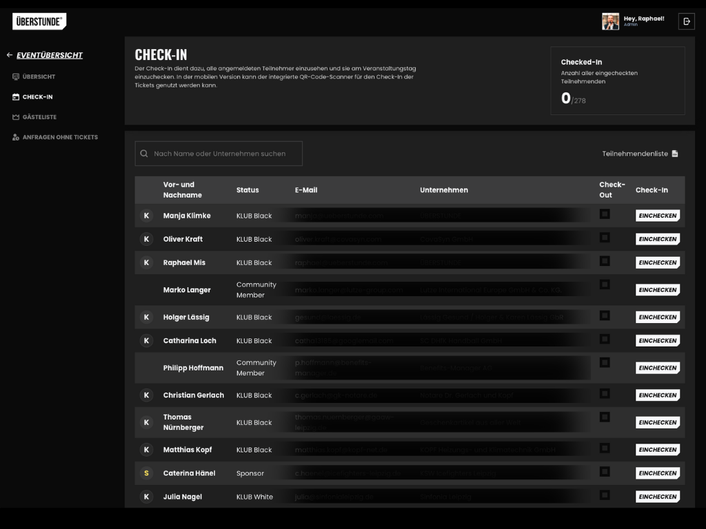 Alle Anmeldungen, Gäste und Member werden im integrierten CRM verwaltet. Veranstalter sehen live, wer teilnimmt, können Anfragen prüfen und Gästelisten exportieren. Das System unterscheidet zwischen Gästen, Community-Mitgliedern, Sponsoren und Partnern – inklusive Filterfunktionen, Kontaktinformationen und Aktivitätsübersicht.