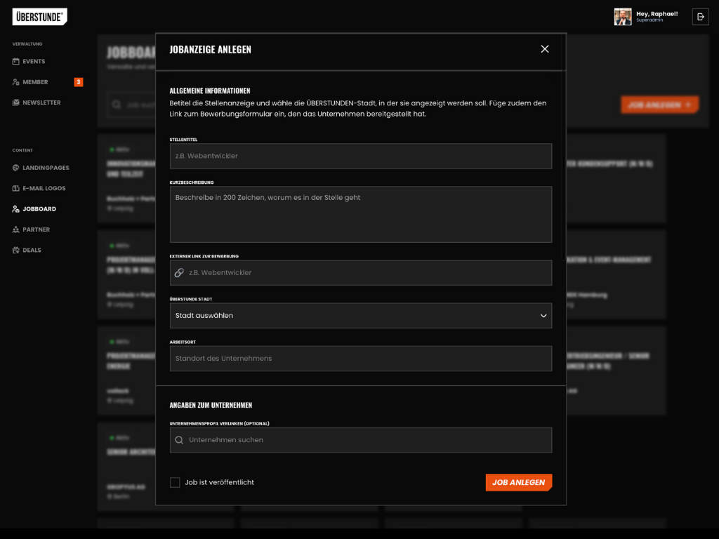 Die neue ÜBERSTUNDE-Plattform hat das gesamte Format auf ein neues digitales Level gehoben. Aus vielen Einzellösungen wurde ein leistungsfähiges Betriebssystem, das Events, Community, Verwaltung und Kommunikation in einem zentralen, unabhängigen System vereint. Was früher verteilt auf Ticketanbieter, Mailing-Tools, Tabellen und externe Plattformen stattfand, ist heute vollständig integriert und effizient gesteuert. Für das Team und alle Franchisenehmer bedeutet das maximale Autonomie: Jede Stadt kann ihre Events, Mitglieder, Newsletter und Partner eigenständig verwalten und gleichzeitig auf einer gemeinsamen technologischen Basis arbeiten. Die Plattform wurde damit zum skalierbaren Fundament für Wachstum – ohne Abhängigkeit von Drittanbietern, ohne laufende Ticketgebühren und mit voller Kontrolle über Daten, Nutzer und Prozesse.