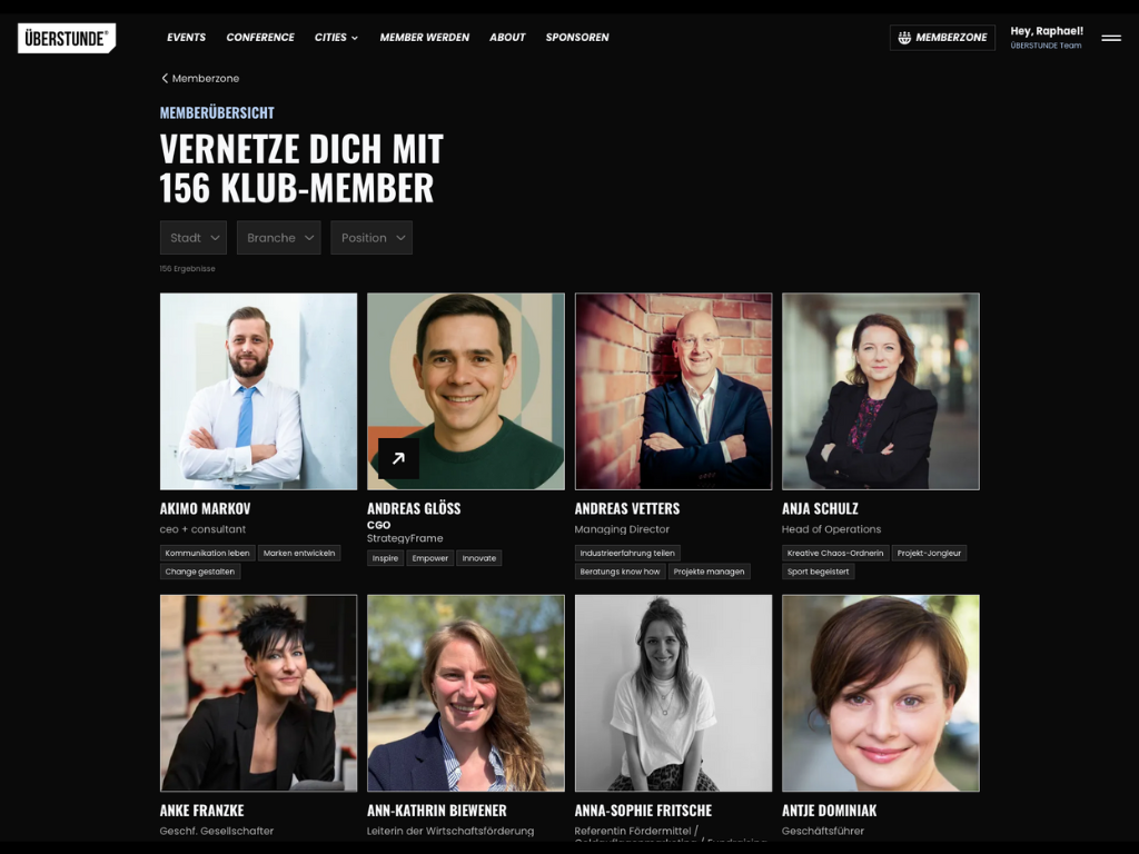 ÜBERSTUNDE verbindet öffentlich zugängliche Events mit einer exklusiven Community. Mitglieder haben eigene Logins, können Profile pflegen, Events priorisiert buchen und erhalten personalisierte Inhalte. So entsteht eine starke Community-Struktur, die langfristige Bindung und Interaktion fördert.