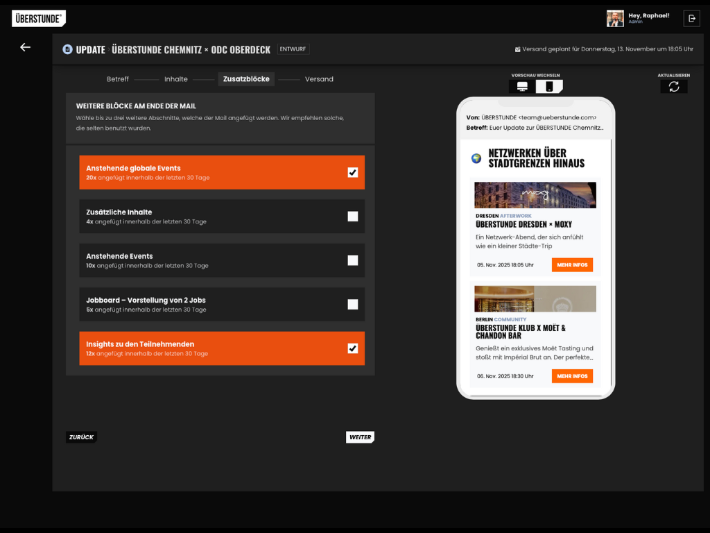 ÜBERSTUNDE ist eines der am schnellsten wachsenden Business-Networking-Formate in Deutschland. Was als regionales Afterwork-Event begann, entwickelte sich innerhalb weniger Jahre zu einem landesweiten Netzwerk mit weit über 150 Veranstaltungen im Jahr und mehr als 20.000 Teilnehmenden. Mit diesem Wachstum wuchs jedoch auch die Komplexität: Jede Stadt hatte eigene Strukturen, Tools und Prozesse, das Ticketing lief über externe Anbieter, Newsletter wurden in Dritt-Tools erstellt und das Teilnehmermanagement verteilte sich auf verschiedene Systeme. Die Marke war stark, doch die digitale Infrastruktur hatte Mühe mitzuhalten.